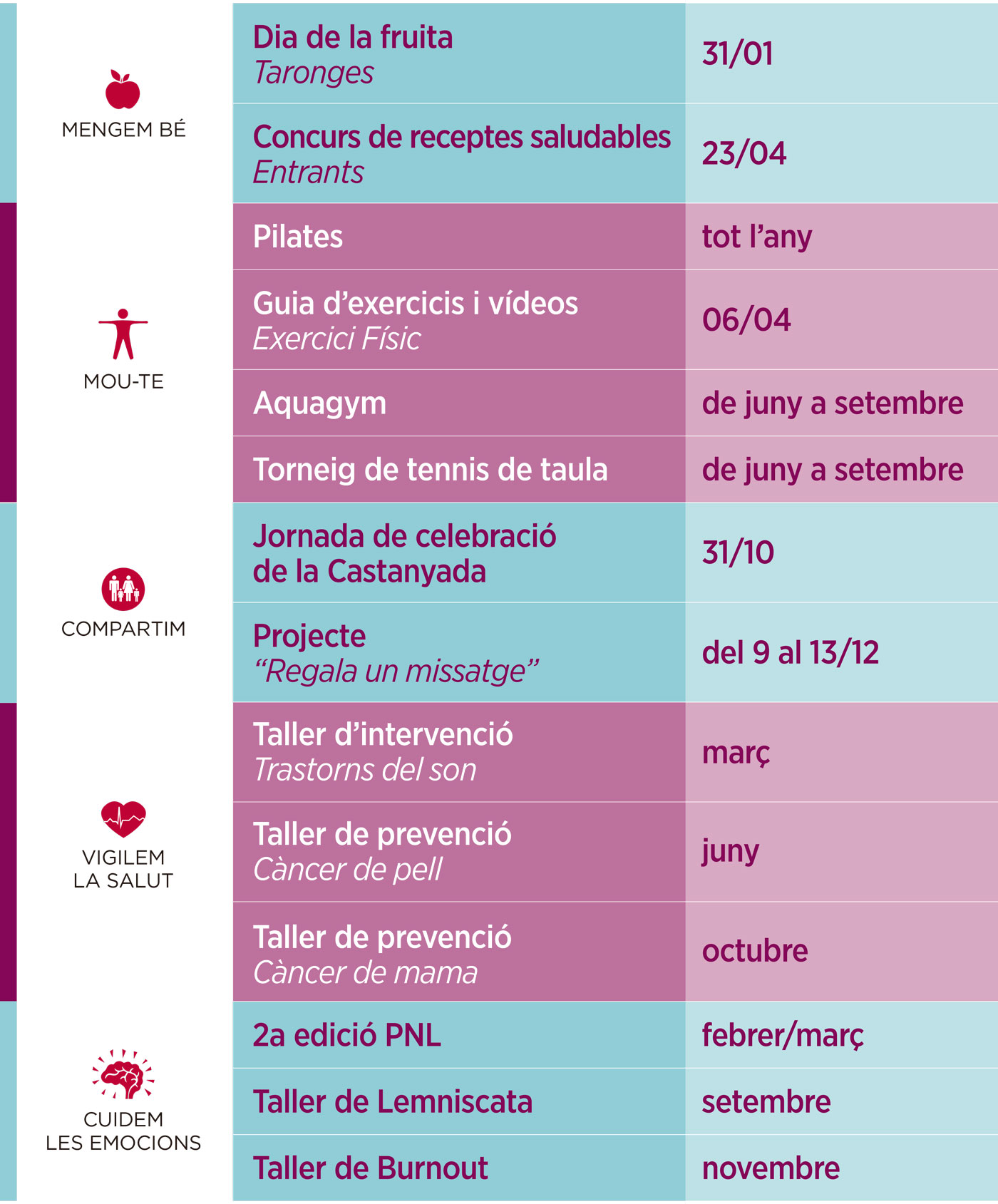 El proyecto Fem Salut de la Fundació Hospitalàries Barcelona tiene como objetivo promover la salud entre el personal colaborador y generar un entorno de trabajo saludable. Para ello, a lo largo del año se llevan a cabo acciones que se enmarcan en cinco dimensiones: Vigilem la salut, Mengem bé, Mou-te, Cuidem les emocions y Compartim.