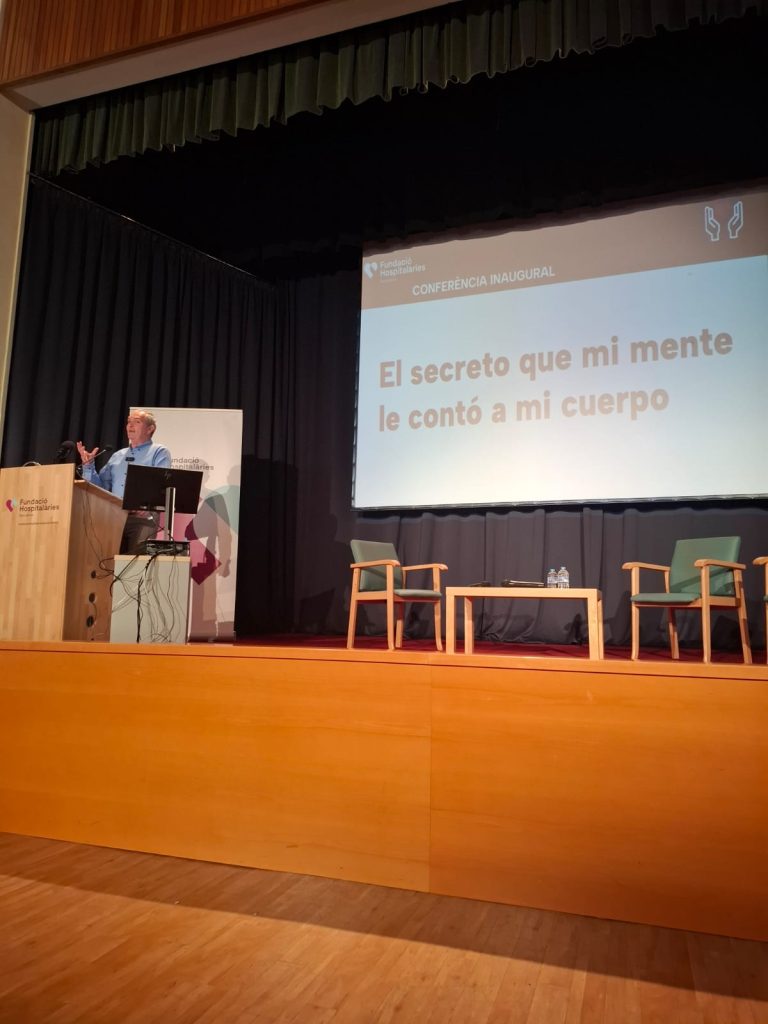A continuació, a la sala d’actes, el doctor Jesús Ezquerra i Sor Matilde Porras, director gerent i superiora de la Fundació Hospitalàries Barcelona, respectivament, van presidir l’acte inaugural i van introduir al conferenciant, l’Eduard Torras, president de Sport2live. Torras va dictar una xerrada inspiradora i motivadora amb el títol de ‘El secreto que mi cuerpo le contó a mi mente’, durant la qual va compartir amb les persones assistents tres històries vitals succeïdes en els darrers 15 anys i que li han permès tant superar l’addicció a les drogues i l’alcohol com fundar Sport2life, una organització compromesa en ajudar, a través de l’exercici físic, persones amb un diagnòstic de salut mental, problemes d’addiccions, així com joves en risc d’exclusió social.
